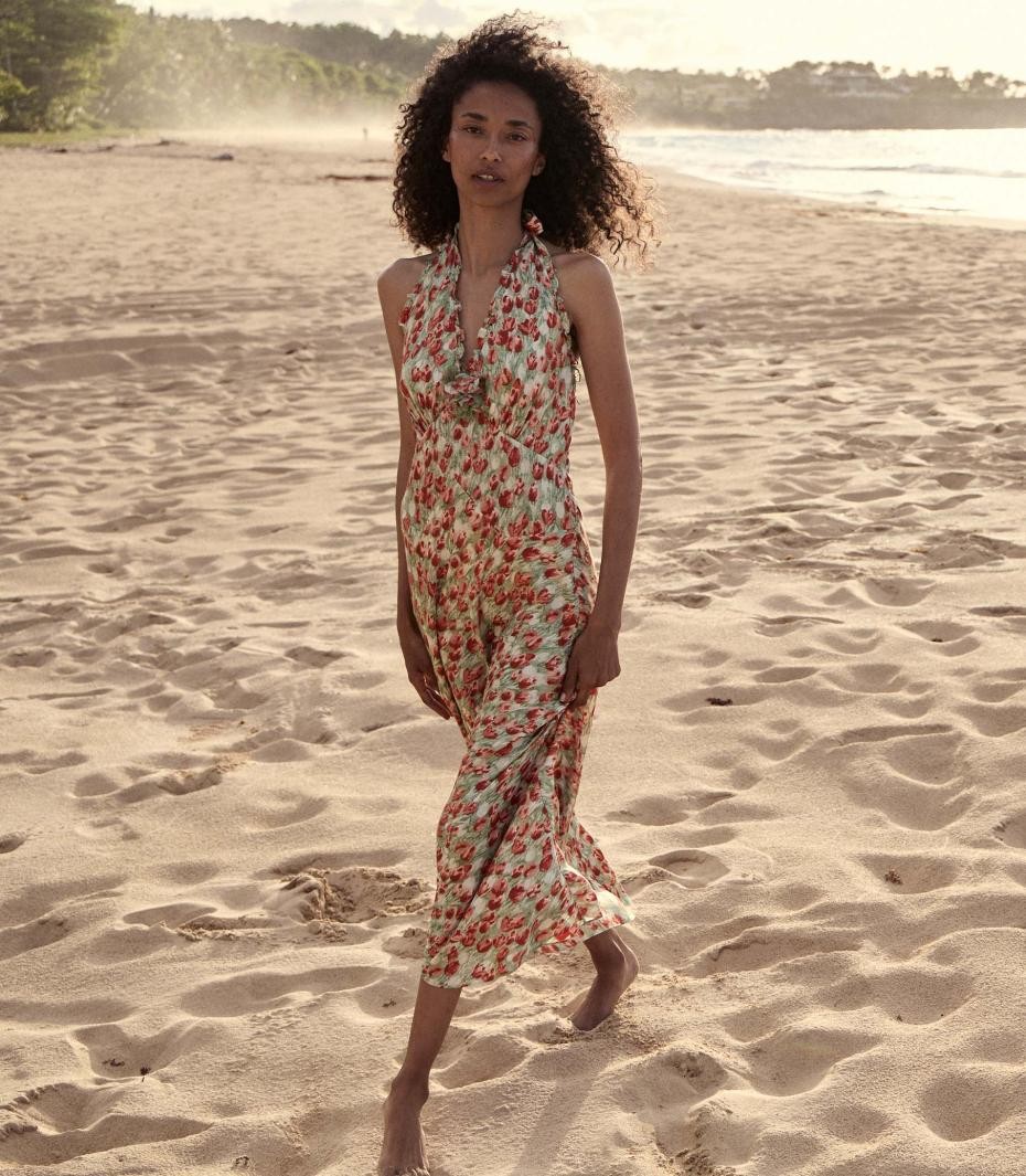 I meascán síoda-viscós ime, tá muineál halter tumtha maisithe le rufálacha beaga agus bróiste róiséid georgette síoda inbhainte, bodice feistithe le zipper taobh dofheicthe, agus sciorta claonta a shníonn go dtí an rúitín ar an nGúna Mazarin spreagtha ag na 90idí.