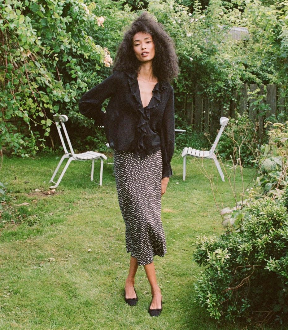Déanta as twill síoda-viscós imeach agus déanta inár Camille Dot nostalgic, is leagan beagán níos giorra é an Sciorta Elowena dár Sciorta Elowen spreagtha ag na 90idí. Tá coim ard air le mionsonraí scallop leaisteacha agus sciorta claonta sreabhach a shroicheann lár na lao.