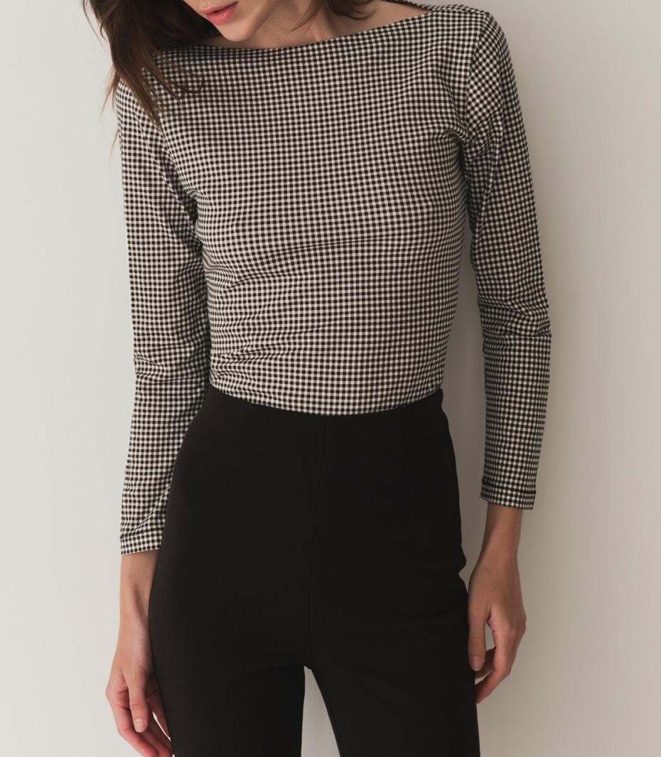 Tillverkad av mjuk 100 % ekologisk bomull och gjord i vår nostalgiska La Maddalena Gingham-mönster. Den 60-talsinspirerade Paulette-tröjan har en bateau-ringning, trekvartsärmar och en åtsittande silhuett.