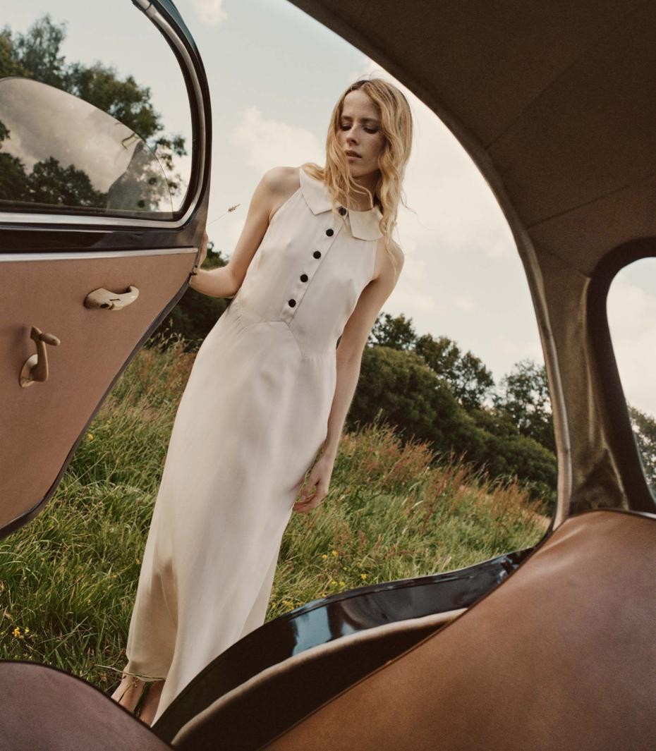 Tereyağı ipek-viskon karışımından dikilmiş ve viskon krep de şin astarlı, 30'lardan ilham alan Clayton Elbise, geniş yakalı, vintage dikişli ve kontrast saten kaplı düğmeli, kolsuz bir modeldir. Görünmez yan fermuarlı, vücuda oturan korsaj, bileğe kadar uzanan eğik kesim eteğe dönüşür.